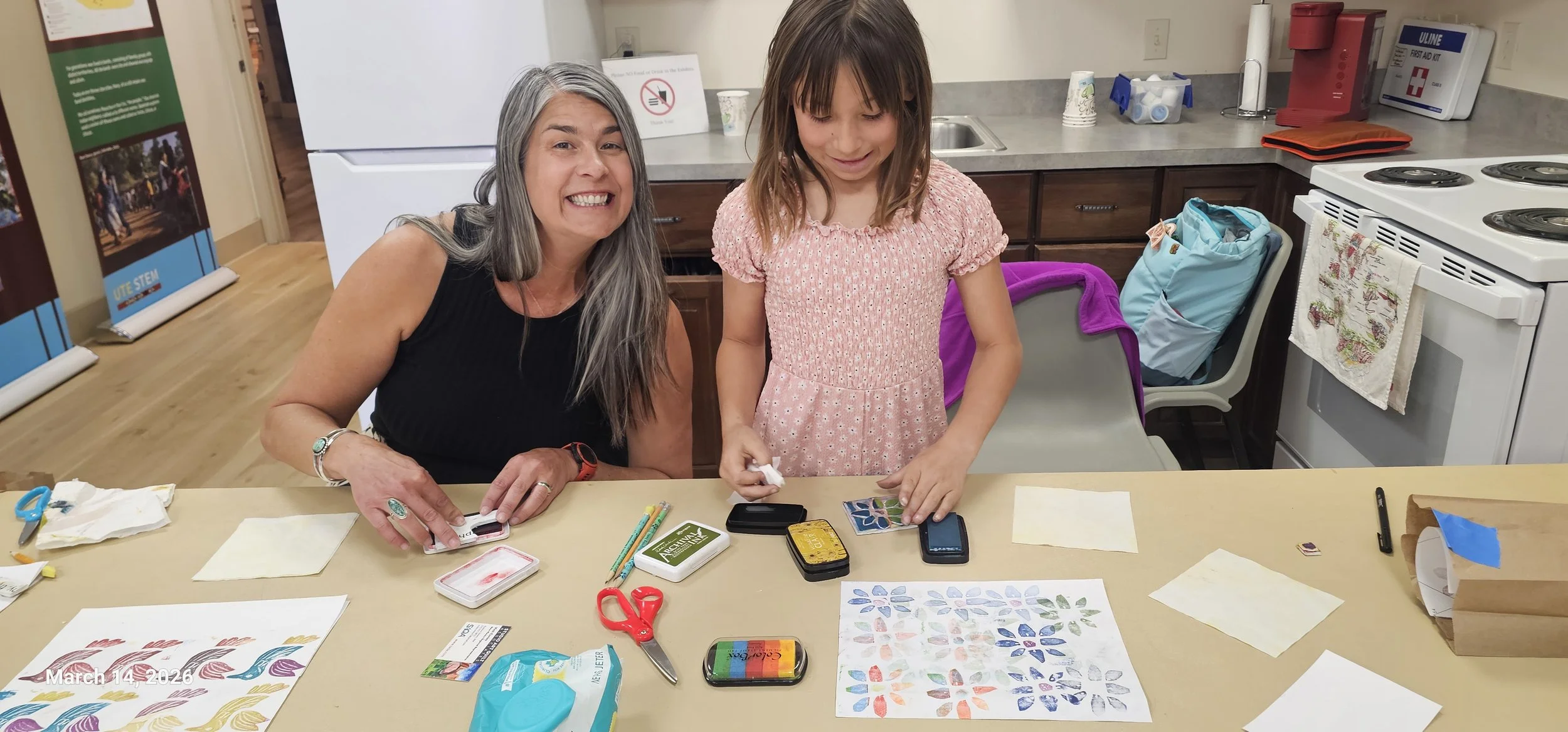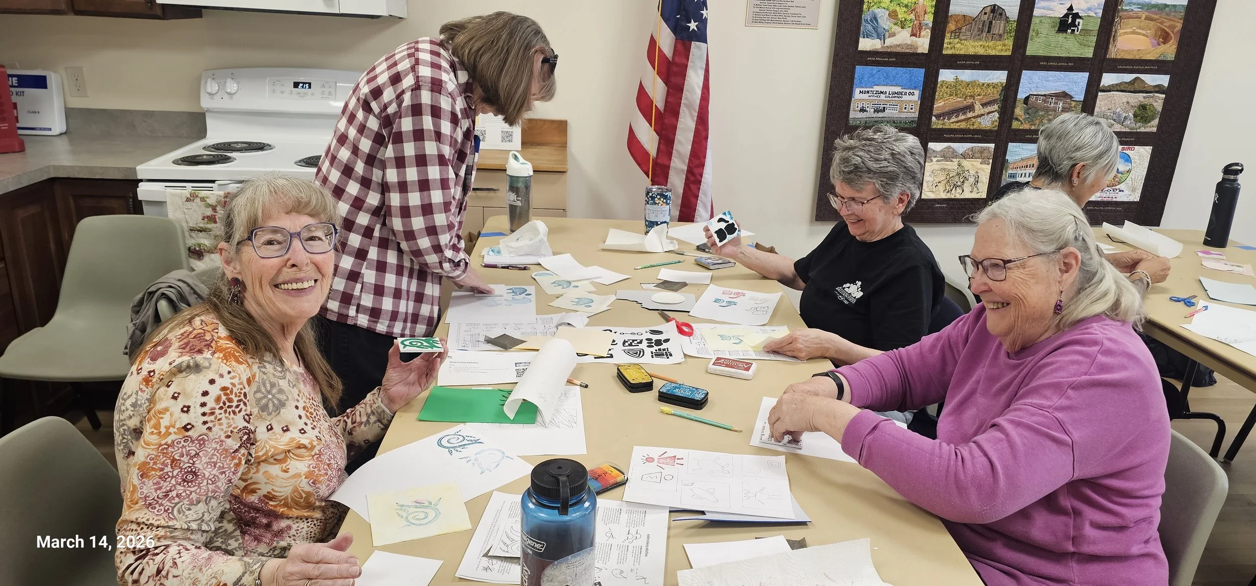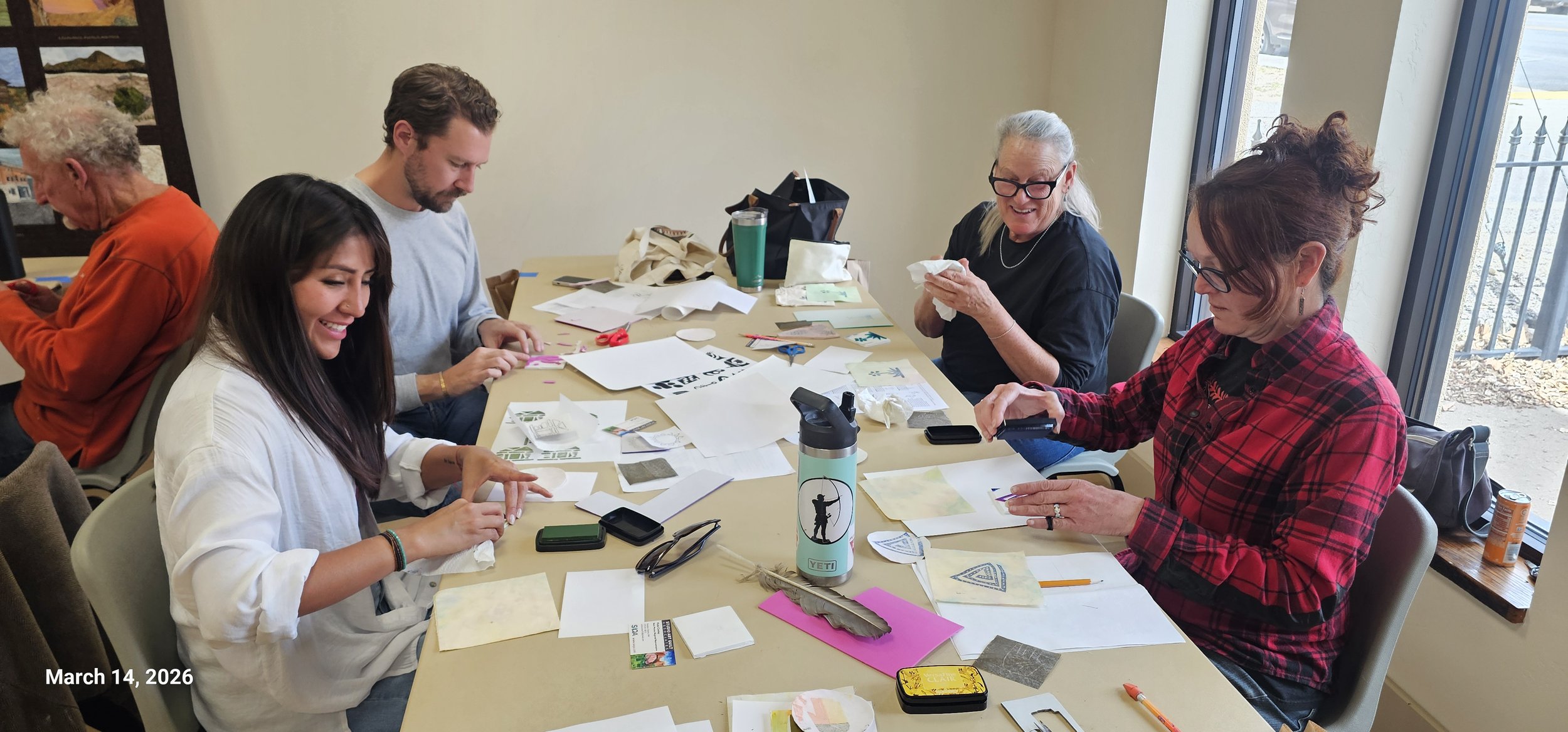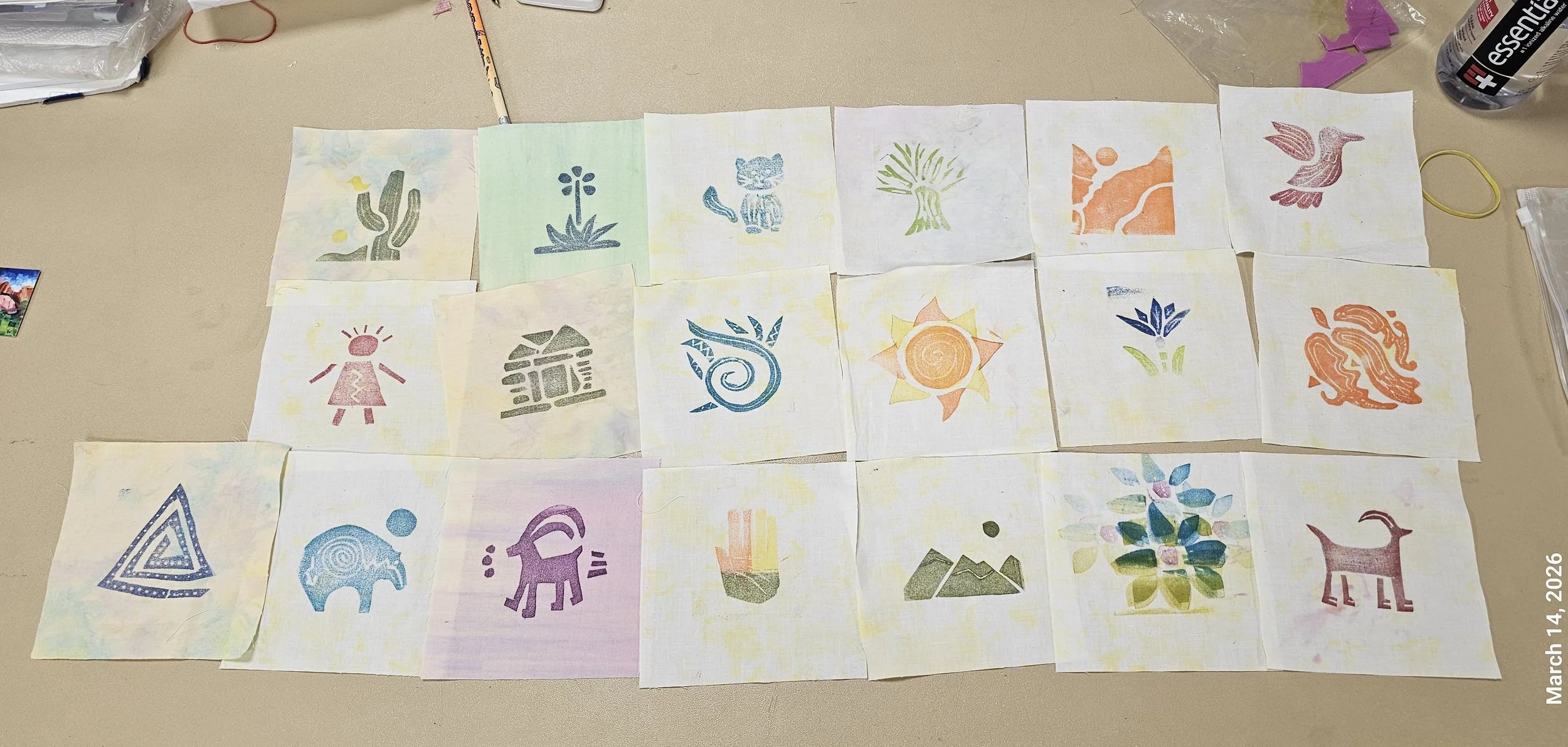 I gave a class today in simple block printing. The participants used ideas that they had brought inspired by Canyons of the Ancients National Monument. We cut simple shapes out of sticky foam and stuck them onto a little blocks. They printed on card stock, fabric and a little patch that they could sew on a backpack. I think they all had a great time.