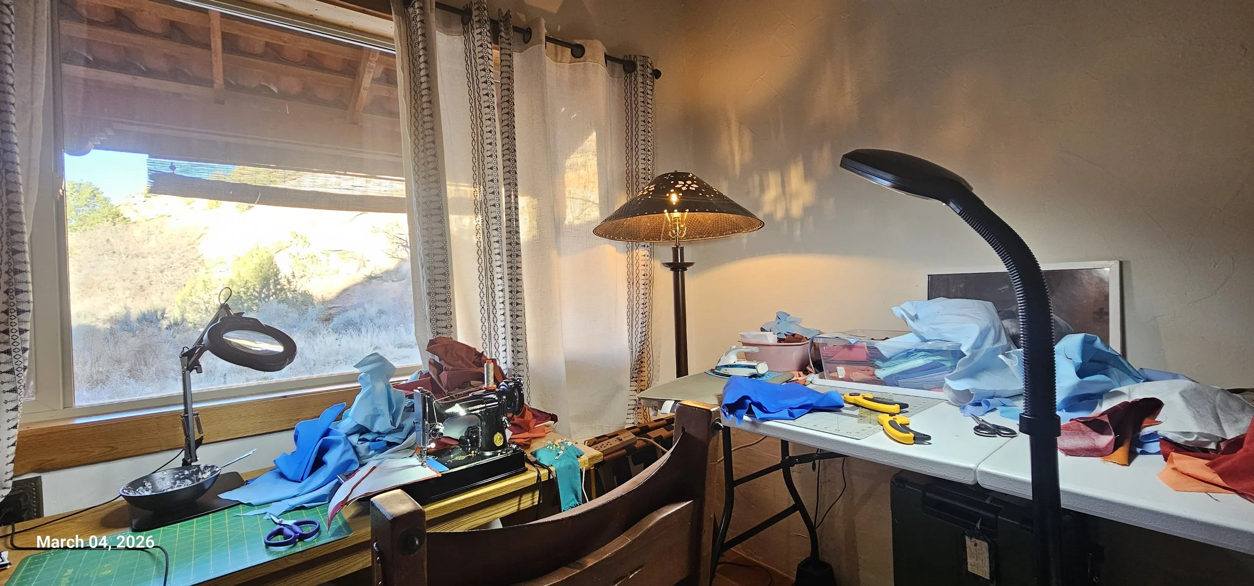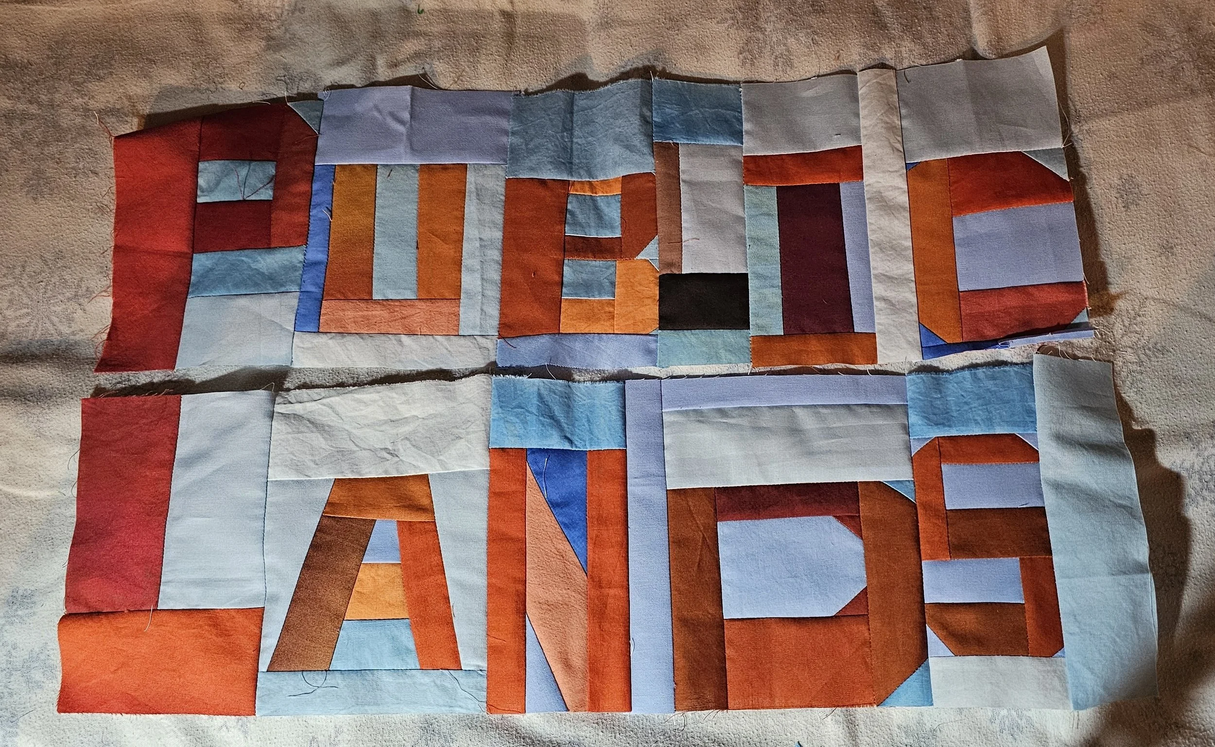 I’ve set up a small sewing area in my casita and have been working on a couple of projects inspired by the colors of the surrounding landscape. This piece features some improv lettering. I’m planning to create a series of phrases about protecting public lands in this style and combine them into a larger art quilt.