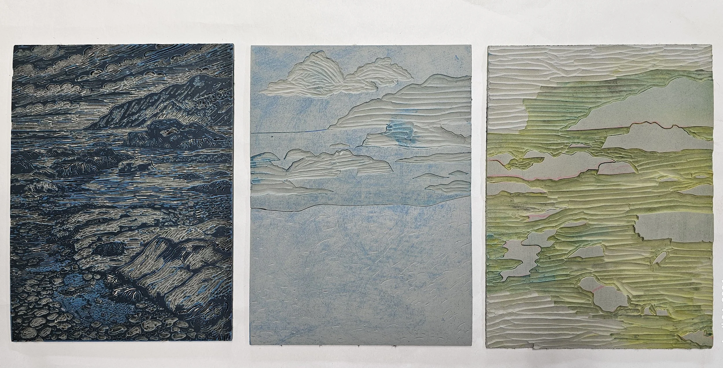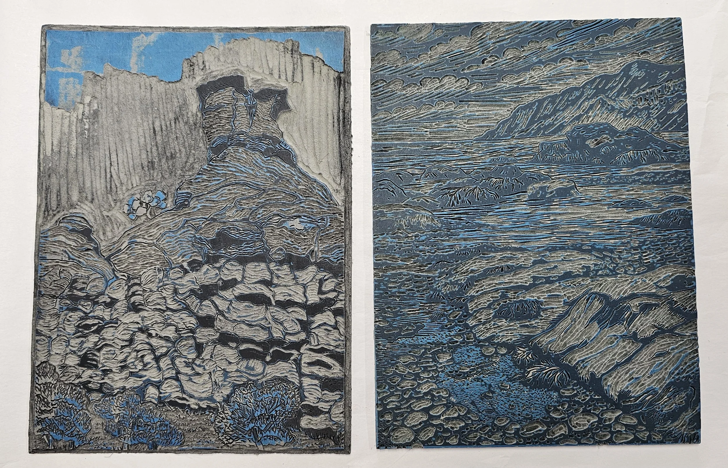 Since coming home from my residency at Canyons of the Ancients National Monument, I’ve been concentrating on learning multi-block printing and reduction printing. I’ve been working with the block I carved during the residency, as well as an older block I carved some time ago of a beautiful beach scene in Newfoundland.