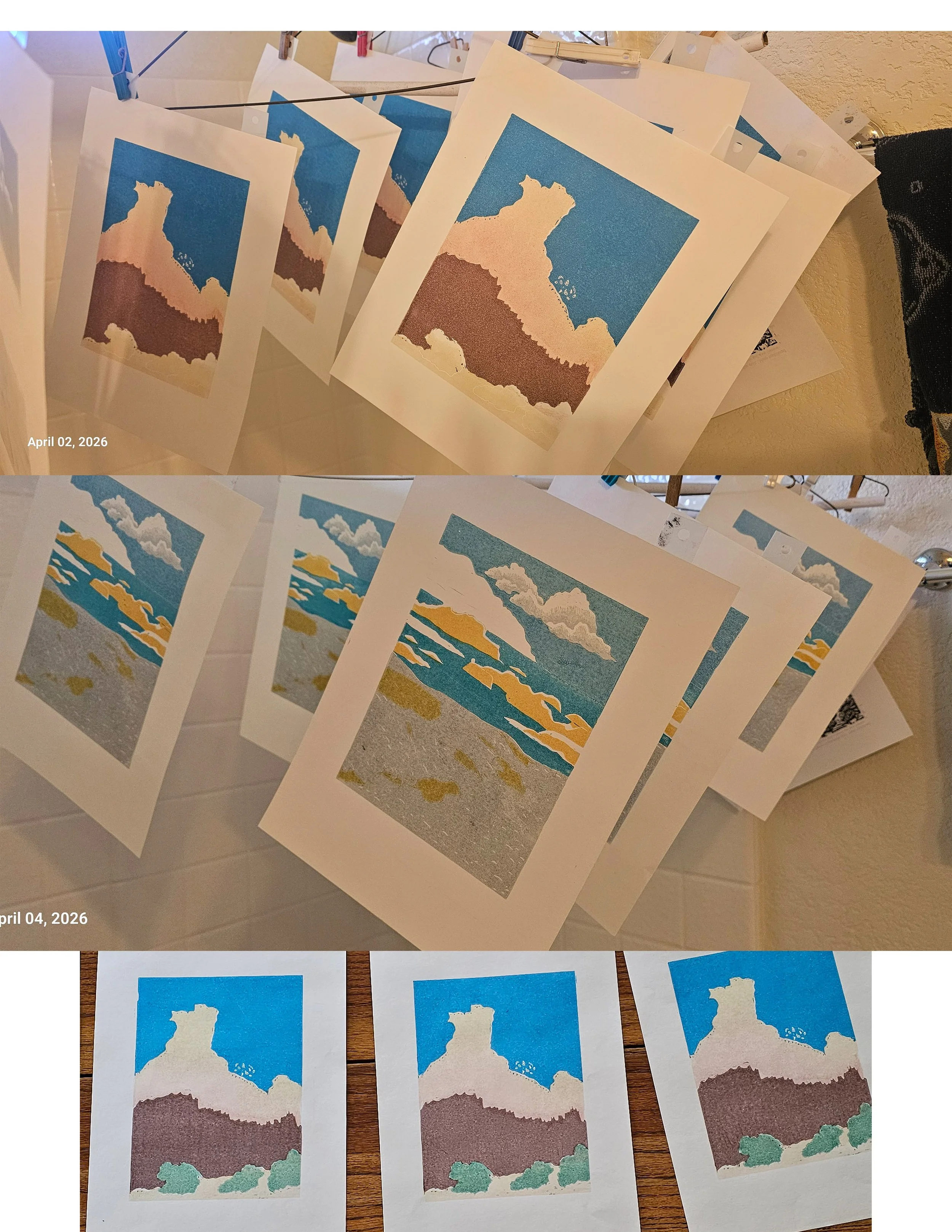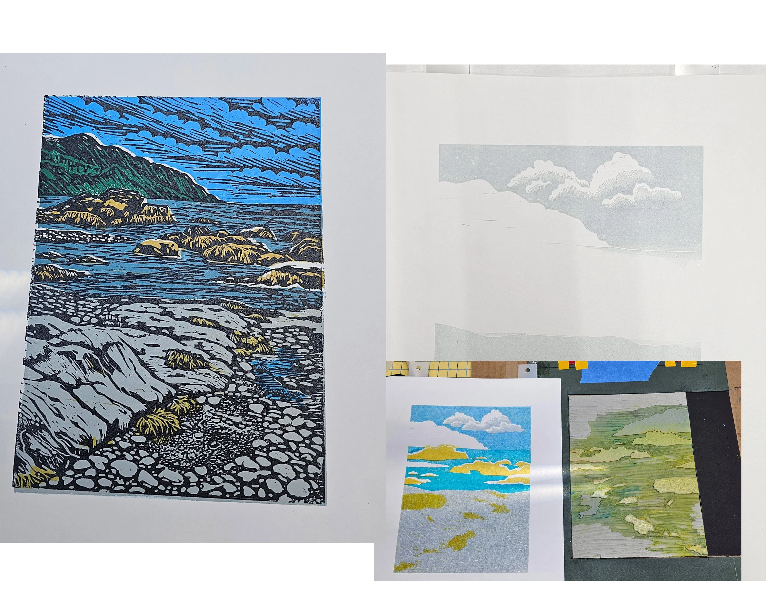 Left, Low Tide the first print with terrible sky/clouds. Right, some of the progression of prints showing the new sky/clouds