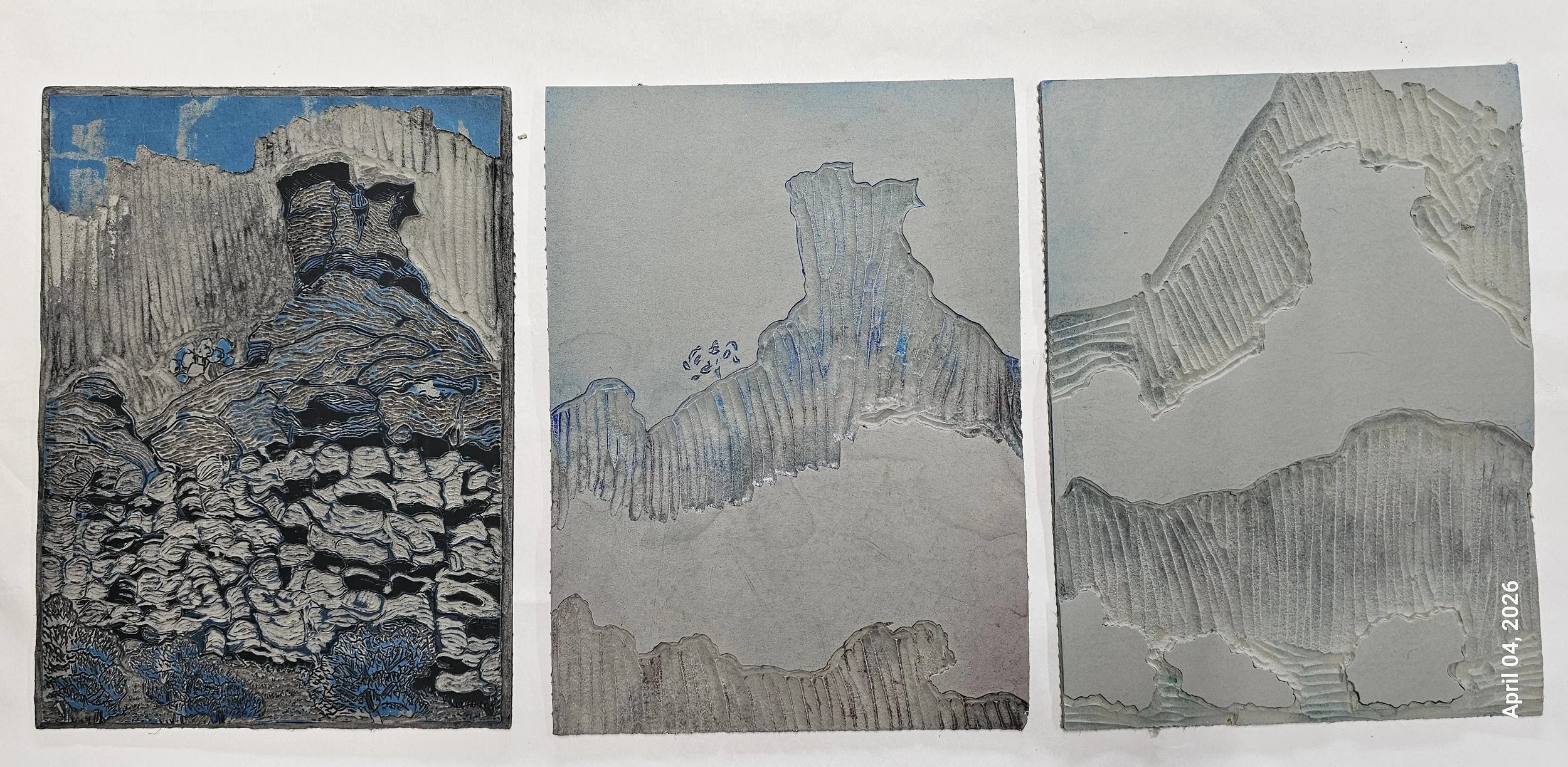 Another challenge is simply deciding how many blocks are needed to get the effect I want. For the rock formation print I started at the residency, I ended up refining the original block and carving a couple of additional blocks to handle the different cliff colors and tree areas. That print now uses three plates and four colors.
